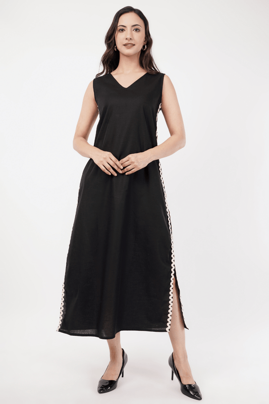 Black Maxi A-Line Dress with Lace Detailing & Slits
