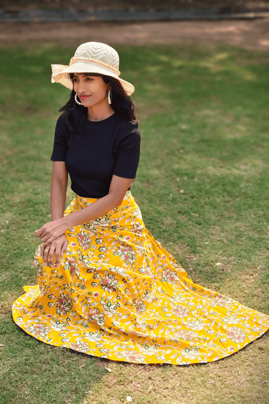 Yellow Floral Maxi-Length Wrap Skirt in Premium Rayon
