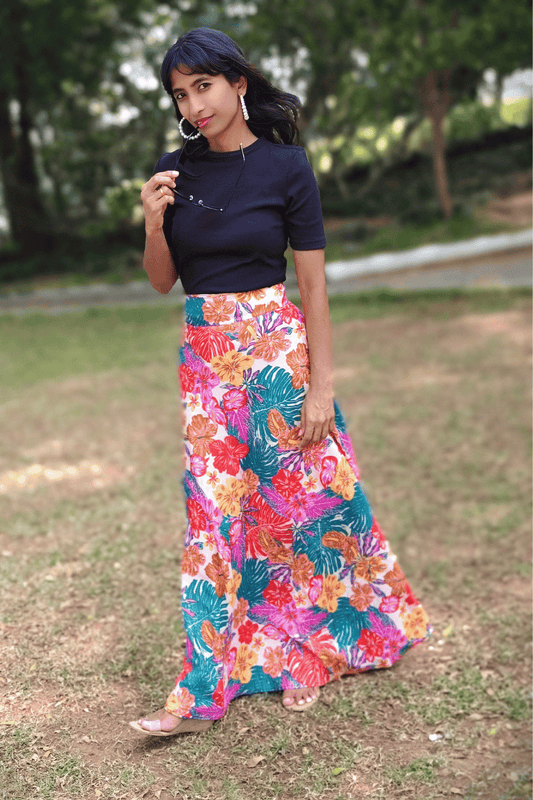 Navy Blue Floral Maxi-Length Wrap Skirt in Premium Rayon