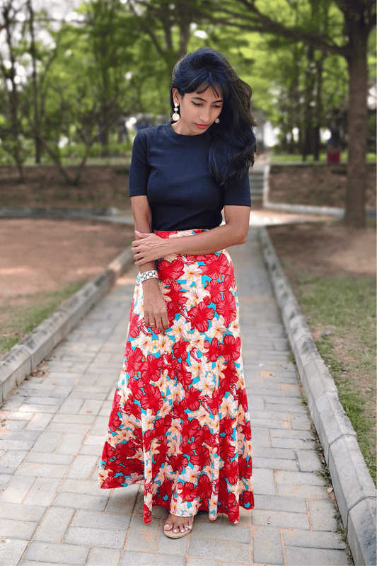 Red Hibiscus Maxi-Length Wrap Skirt in Premium Rayon