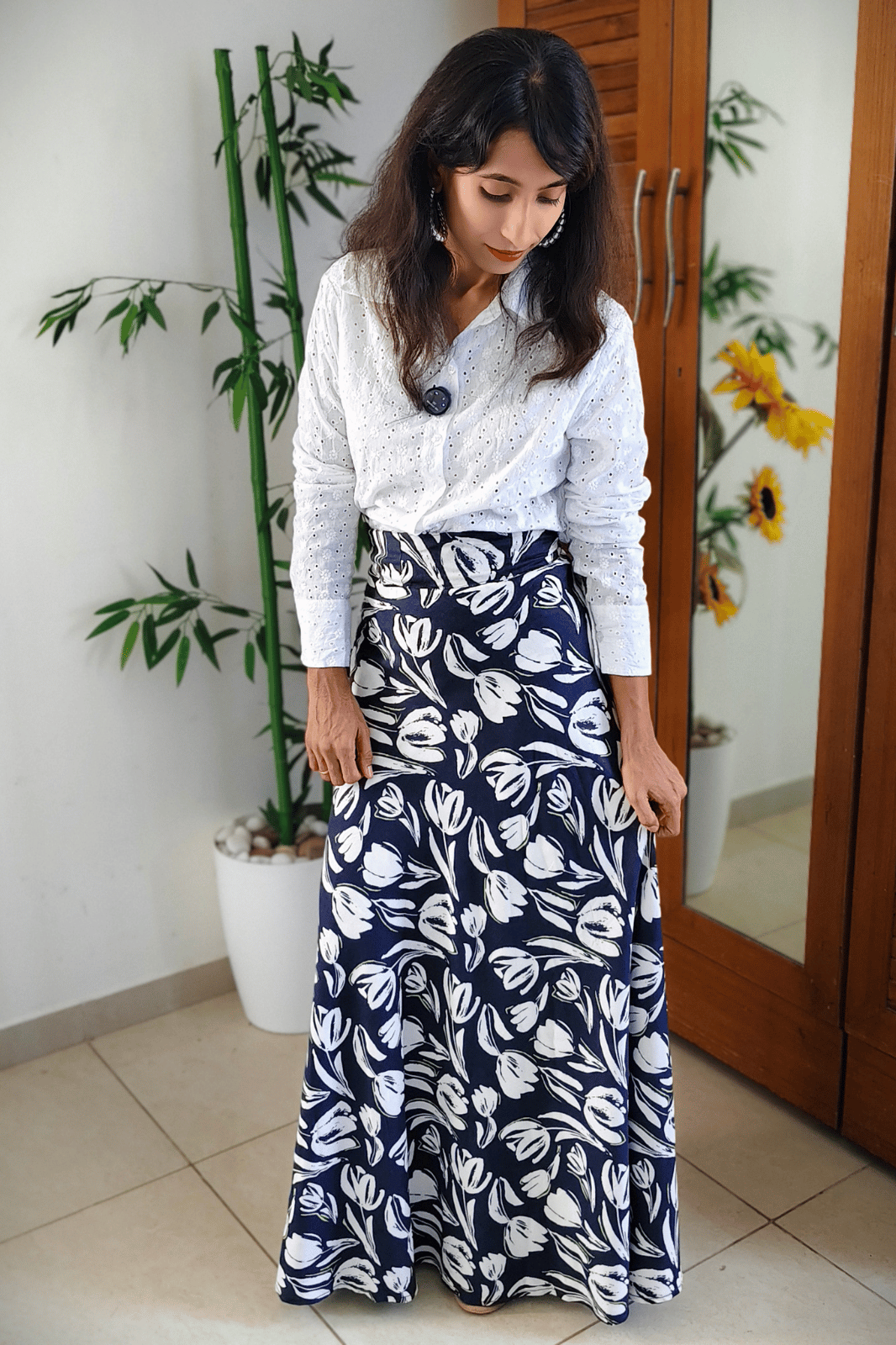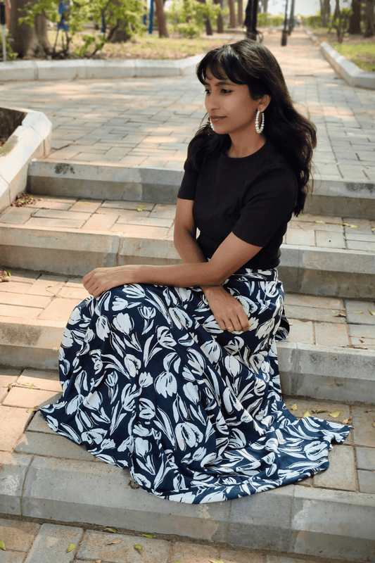 Navy Blue Floral Maxi-Length Wrap Skirt in Premium Rayon