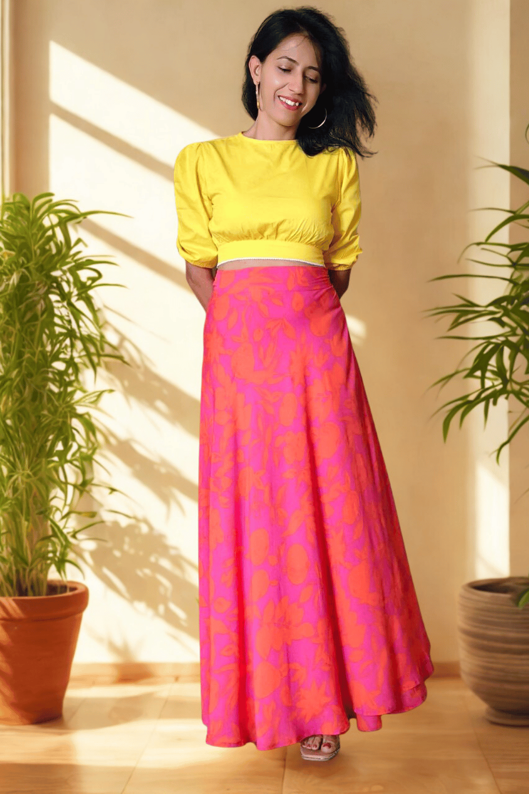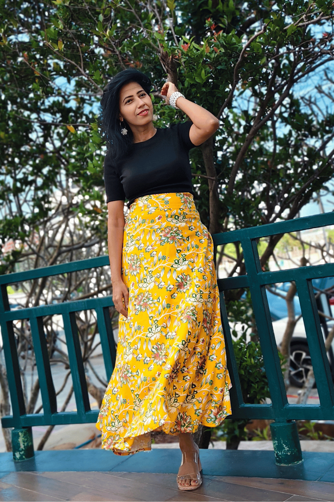 Yellow Floral Maxi Wrap Skirt & Black Ribbed Crop Top Combo