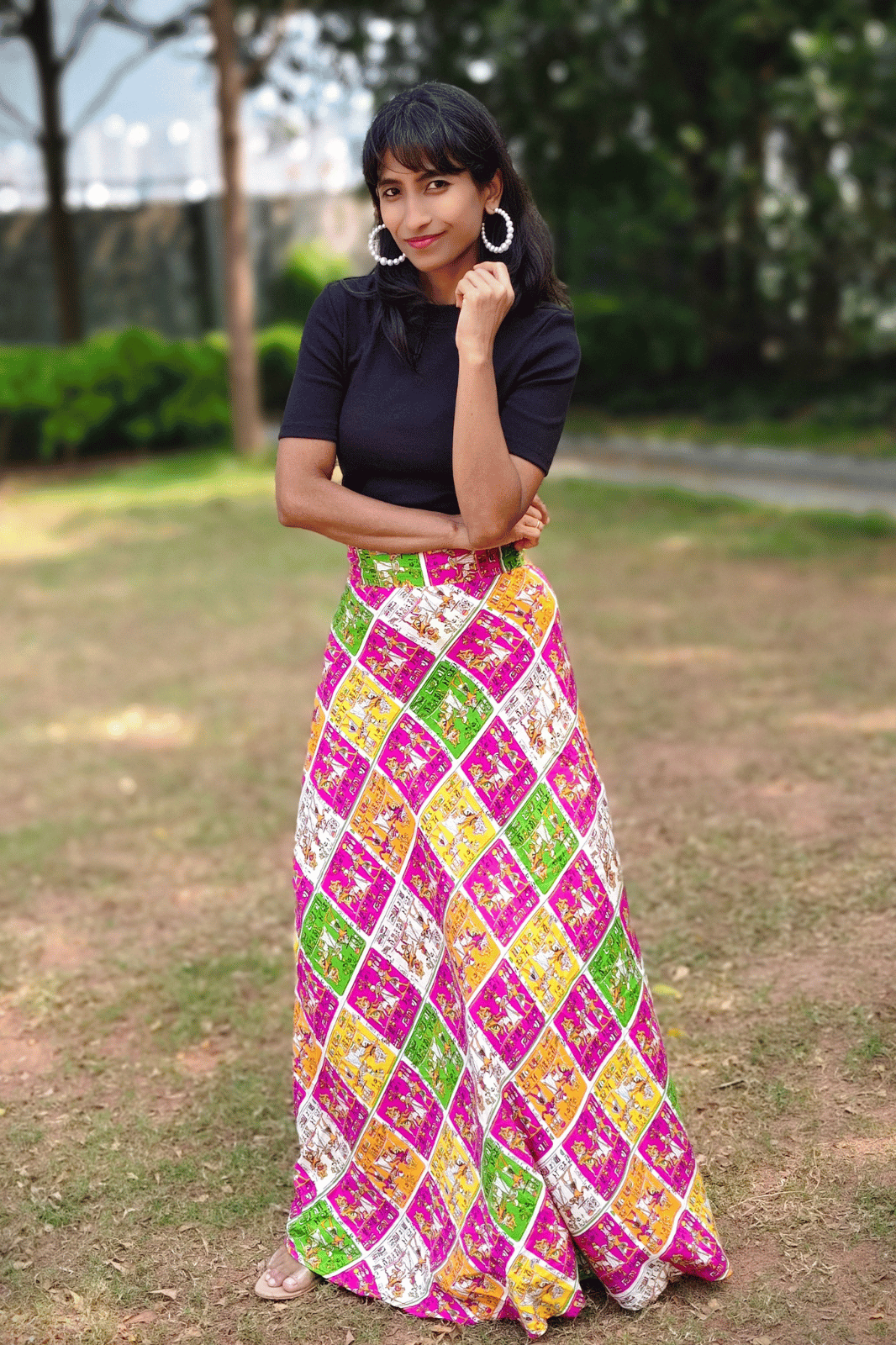 Our Egyptian Print maxi length wrap skirt is crafted from premium export quality rayon fabric, ensuring both comfort and durability. The skirt features a unique interlock system for a secure fit, achieved by passing the belt through a keyhole and tying it at the back or side according to your preference. The perfect flare of the skirt not only enhances its aesthetic appeal but also provides ease of movement, making it ideal for any occasion.