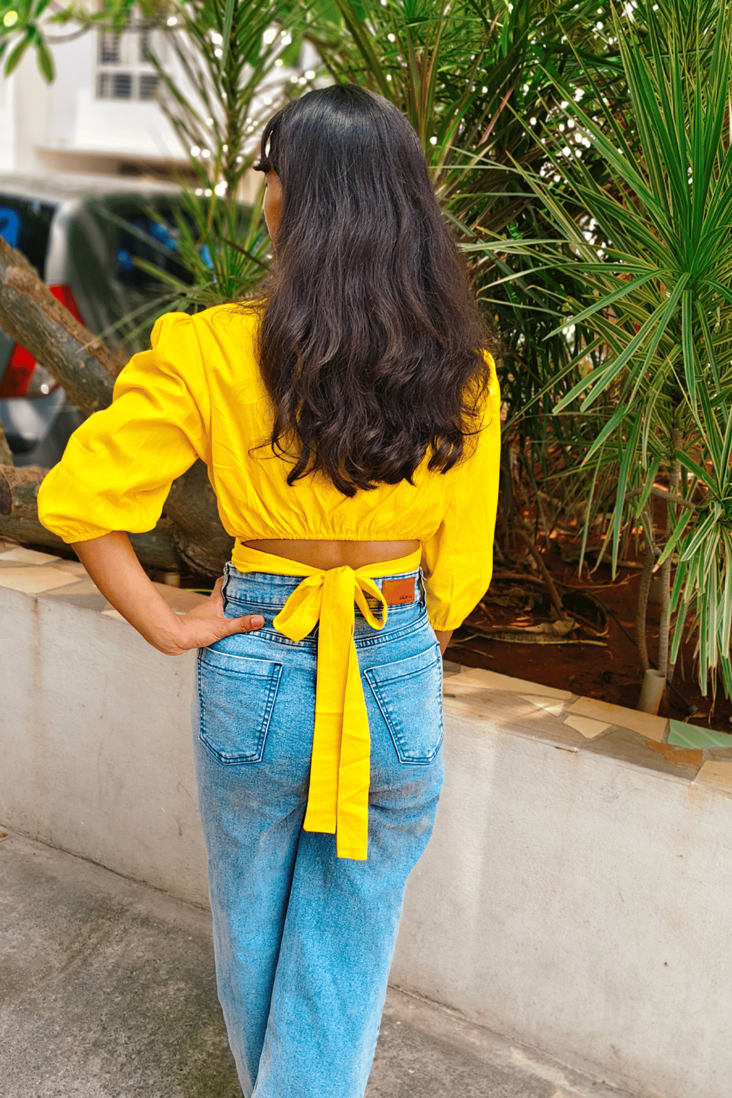 Yellow Puff Sleeve Crop Top with Lace Detailing